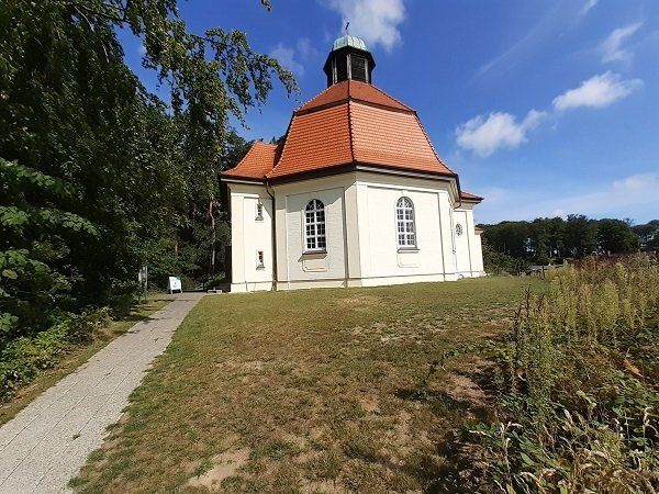 Nach dem Besuch des Friedensberges geht es wieder stadteinwärts, als wir auf einem weiteren Hügel im Ort ein Bauwerk entdecken, dass eine kleine Kirche sein könnte. Das achteckige Gebäude ist tatsächlich eine Kirche und zu unserem Glück geöffnet. Wir treten in dieses kleine einfache Gotteshaus ein. Sie ist in ihrer Schlichtheit und mit der Holzdecke schon fast gemütlich. Die Kirche wird hier auch die „Königliche“ genannt – und das mit gutem Grund. Das Grundstück, auf dem sie steht, wurde der Gemeinde von der Fürstin von Putbus überlassen. Und die Altarbibel stiftete die Deutsche Kaiserin und Königin von Preußen Auguste Victoria. Leider brannte die kleine Kirche 1960 und trug große Schäden davon. Trotz der Bedingungen zu Zeiten der DDR, wurde sie von der Kirchgemeinde wieder aufgebaut und bekam damit ihr heutiges Aussehen.