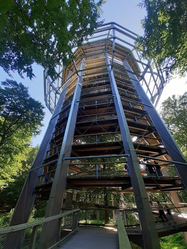 Es ist früher Nachmittag und so geht es weiter. Auf Rügen gibt es noch so viel zu entdecken. Also führt uns das nächste Ziel nach Prora – einen Ortsteil von Binz. Hier befindet sich das Naturerbe Zentrum Rügen und der Baumwipfelpfad. Solche Pfade gibt es einige in Deutschland und uns bietet es sich an, hier einen dieser zu Besuchen. Laut Flyer ist er über einen Kilometer lang und bis zu 17 Meter hoch. Der „Aufstieg“ ist eine große kreisförmige Rampe. So ist der Pfad barrierefrei und kann auch mit Rollstuhl oder Kinderwagen befahren werden. Unser Abenteuer „Baumwipfelpfad“ beginnt. Und nur wenige Minuten später stehen wir in Mitten Buchenkronen auf Augenhöhe mit den einheimischen Vögeln und Eichhörnchen. Auf dem Pfad gibt es immer wieder Einbuchtungen mit viel wissenswerten über die Natur und Geschicklichkeit-Parcours. Diese Parcours machen nicht nur Kindern Spaß. Dann gabelt sich der Weg und durch das Laub der großen Buchen wird ein Turm sichtbar. Der Aussichtsturm „Adlerhorst“ ist – in zweifacher Sicht – der Höhepunkt des Baumwipfelpfades. Einmal wegen seiner Höhe und zum anderen wegen der Aussicht. Auch auf den Turm gelangt man über eine Rampe. Die führt um eine Buche herum noch einige Meter über die Krone hinaus. Als wir oben ankommen, befinden wir uns in 40 Meter Höhe und überragen den Baum um zehn Meter. Der Blick ist atemberaubend. Von hier aus kann man die ganze Insel überblicken.