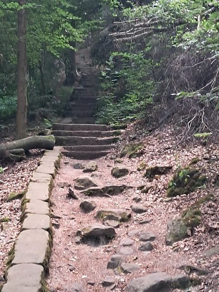 Dieser verläuft im Wald zunächst fast parallel zur Elbe und biegt dann rechts in Richtung Schöna und Reinhardtsdorf ab. Diese Teilstrecke steigt stetig an. Doch die Anstrengung lohnt, denn am oberen Ende bietet sich dem Wanderer eine wunderschöne Aussicht auf die Schrammsteine und der Böhmische Schweiz sowie dem Zirkelstein und der Kaiserkrone. Beide können mit einem kleinen Abstecher erklommen werden. Und auch hier lädt eine malerische Aussicht zum Verweilen ein. Auf dem Weg zum Gipfel der Kaiserkrone kommt man an dem Felsen vorbei, der - oder die Aussicht von diesem Felsen - Friedrich zu dem Bild „Wanderer über dem Nebelmeer“ inspiriert hat.