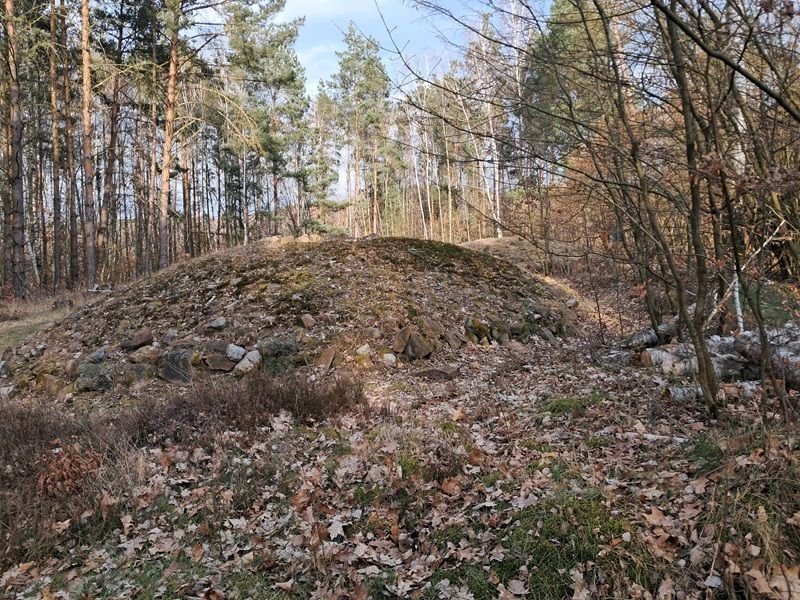 Weiter entlang der Ausschilderung kommt man an ein Gräberfeld aus der Bronzezeit. Die verschiedenen Gräber sind Zeitzeugen einer längst vergangen Zeit. Neben einem Hügelgrab, das einen Durchmesser von 14 Metern und eine Höhe von einem Meter hat, findet man hier auch ein sogenanntes Urnenflachgrab und Opfergruben. Bei Grabungen fand man zerbrochene Gefäße, Bronzereste und Spuren von Feuer, die auf die Art und Weise der Bestattungen der Zeit hinweisen.